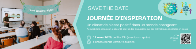 Le 12 mars 2026, le partenariat School For Rights (Ecole des droits de l’enfant) organise un moment d’inspiration pour les enseignant.es avec comme sujet : “Un climat positif en classe dans un monde en mutation”. En une demi-journée, les thématiques de la connexion, la sécurité et le dialogue autour de thèmes sociaux seront traitées. Comme toujours, nous prendrons les droits de l’enfant comme point de départ.
