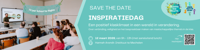 Op 12 maart 2026 organiseert het School for Rights partnerschap een inspiratiemoment voor leerkrachten met als onderwerp ‘een positief klasklimaat in een wereld in verandering’. In een halve dag passeren thema’s als verbinding, veiligheid en het bespreekbaar maken van maatschappelijke thema’s. Zoals steeds nemen we de kinderrechten als uitgangspunt.